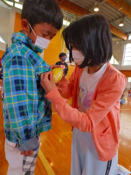 6年生に花を胸につけてもらいます。6年生がこの前作ったお花ですね。