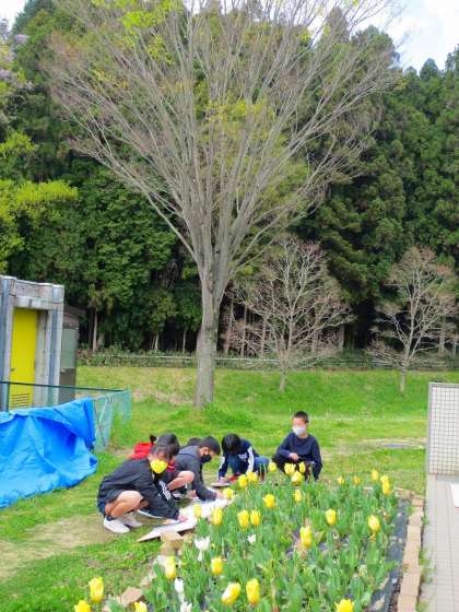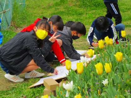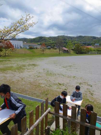 ビオトープの方やせせらぎの近くなど回りました。「みちゃ、いや」と隠したり、「先生、あの子めちゃ上手だよ」と連れて行ってくれたりと、のびのびした気持ちで思う存分描いてください。