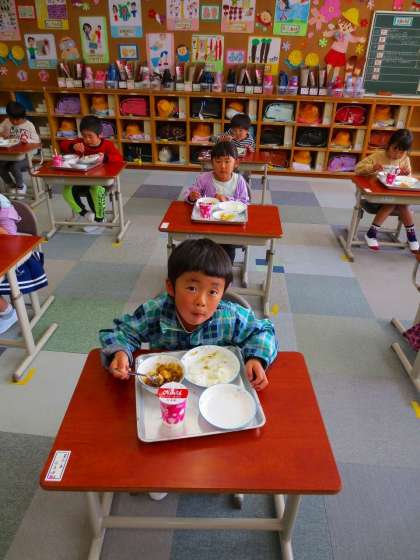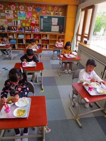 今日から1年生が給食を食べます。
