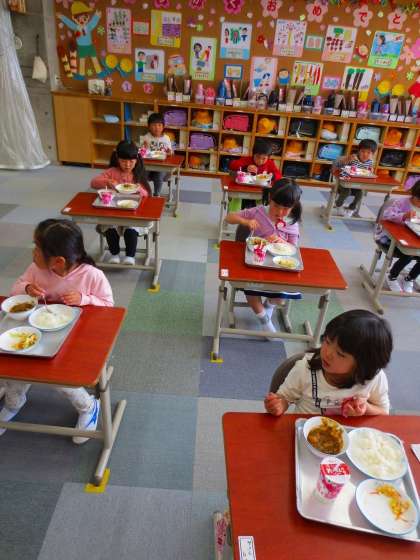 みんなとても上手に食べています。それもしっかりと口に入れ、もぐもぐとしていますね。ほんとはお話しながら楽しく食べるともっと美味しいんだけど、今は我慢しましょう。