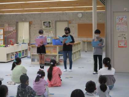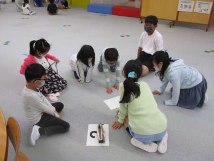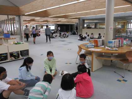 距離間を保ちつつ、グループの名前や目標など高学年がリードしながら話し合いしていました。