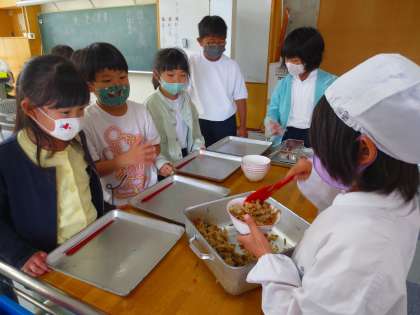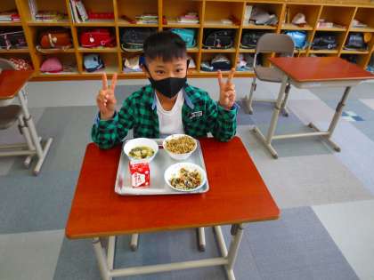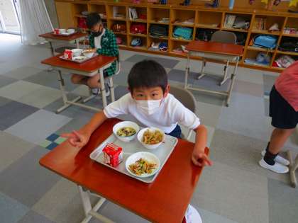4年生は配膳中でした。少人数単位で自分自身で受け取っていくやり方ですね。
