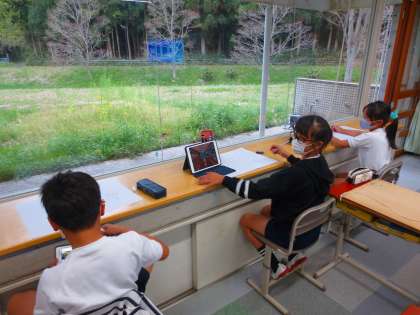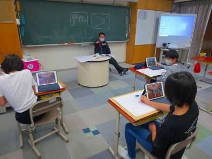 6年生はタブレットを活用して、図工をしています。実際には校内の様子を写生しつつも、タブレットを活用して構図を決めたり、遠近感を確認しています。思い思いの場所で取り組んでいます。