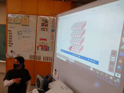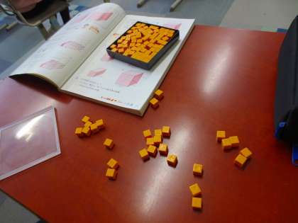 立方体の学習です。「たて×よこ×たかさ」で体積は求めることはできますが、実際のちいさな立方体を使ったり、ICTでシュミレーションで理解したりといろいろな感覚で理解できるような授業でした。