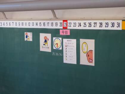 朝の挨拶のやり方をルーティーンでスムースにやりたいのですが、いろんなところに気がいくので、時間がかかることがあります。そのため、朝のパターンを前の黒板に貼って、視覚的にもやることがわかるようにしています。