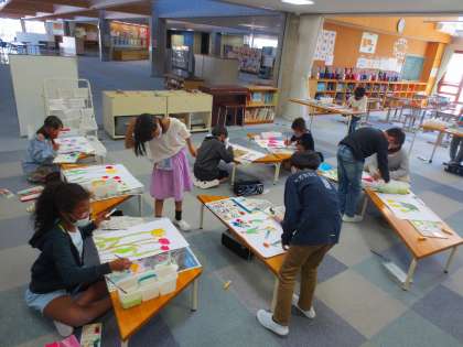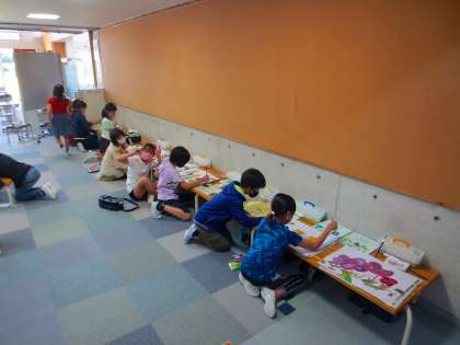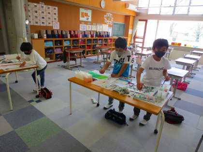 5年生は午後に訪問しました。教室で彩色をしています。思い思いの場所でやっていますが、いつも思うことはじゅうたんの上に絵の具をこぼさないように気をつけているなぁということです。