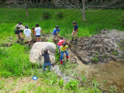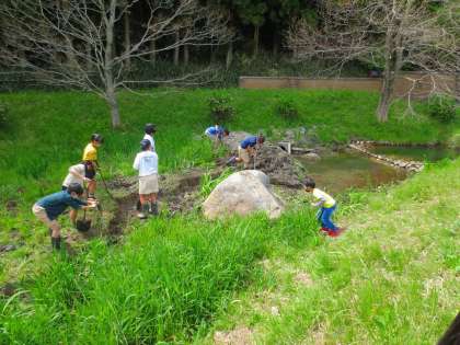 昼放課にダッシュしてくる一団がいます。ゴム長靴に履き替え、シャベルを持ってビオトープへ入っていきます。