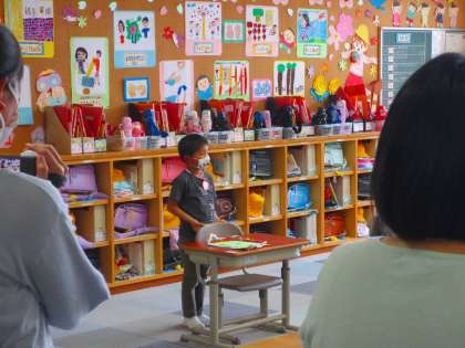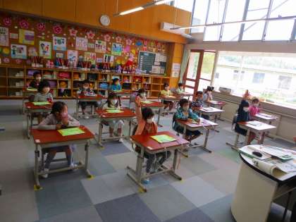 ひゃあ、見事な等間隔に間を空けて参観して頂いています。この人数の中で堂々と発言していると、親としてもうれしくなりますね。私も見ていて嬉しくなりました。