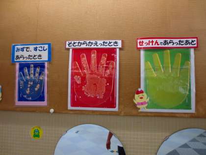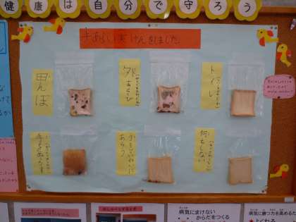 なんと保健室の前には、カビの生えたパンが掲示されています。手洗いの大切さがよくわかります。この時期、食中毒も心配な季節となってきましたからね。