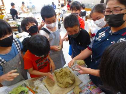 担任が金網のざるを使っていました。なんとところてんのように粘土がざるからでてきます。こういう使い方を初めて見ました。