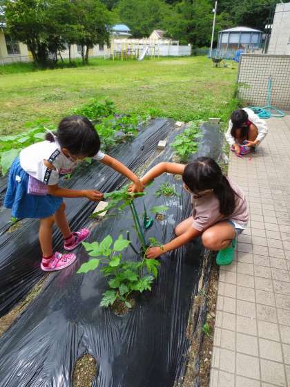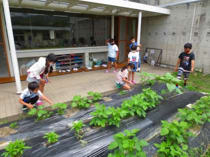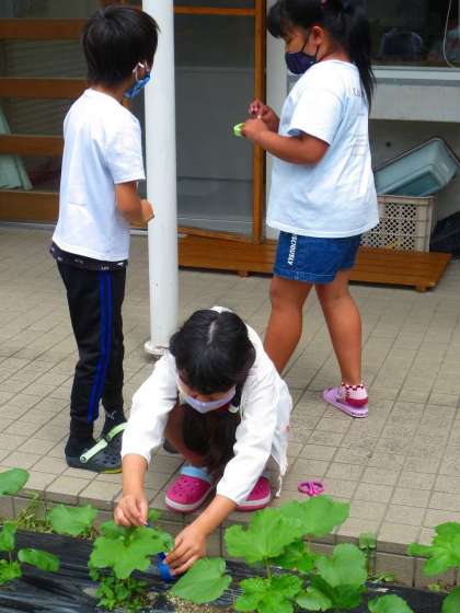 一部の児童がベランダに出て、植物の生長の記録をしていました。前よりどれだけ伸びたのでしょうか。この時期、暑くて雨も多いので植物はぐんぐん伸びます。