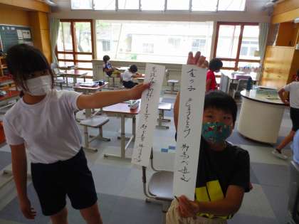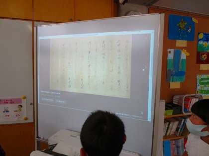 大型提示装置に、ミミズが書いたような文字が並んでいます。江戸時代より前の古文書にはこのような字体がよく見られました。児童からするととても新鮮らしく真似して書いているのを見せてくれます。