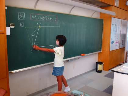 分度器や定規、そしてコンパスといろいろ使って平行四辺形を描きます。描き方がいろいろあるので、前で自分の考え方を説明しています。