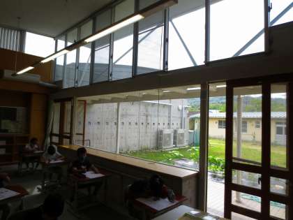 2枚目・天井が湾曲していて、天井に反射した光が児童の上から照らすようになっています。また天井の高さが違うので空気の流れができて、換気もしっかりとできます。