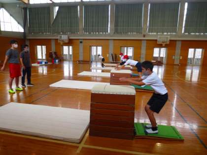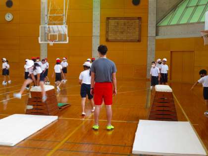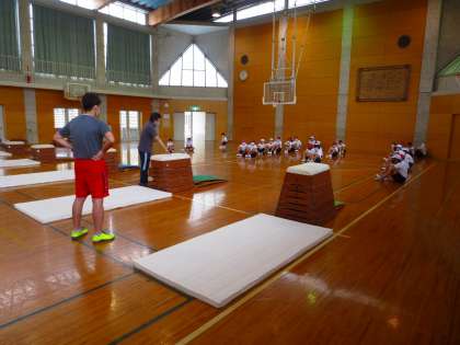 小中一貫教し育を推進するため、昨年度より週に1回、中学校の体育教諭が来校し、5・6年生に授業をしています。今日からは跳び箱をやります。