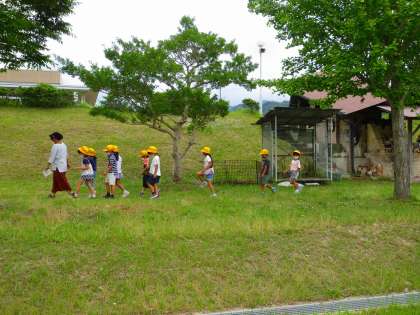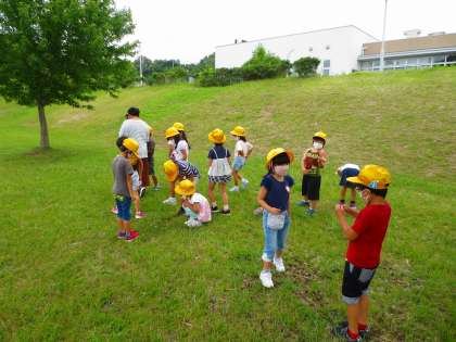運動場の反対側に黄色い帽子が見えたので行ってきました。校地の自然のようすをみています。