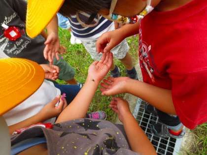 さりげなく咲いている花、まだ誕生間もないコオロギなど、発見するたびに歓声をあげて担任に報告に行きます。