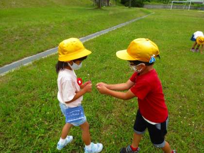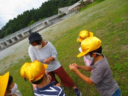 オオバコを使った草花遊びです。茎を絡めて引っ張り合い、茎が切れた人が負けになります。担任に挑戦したり、友だちとやったりと楽しそう。