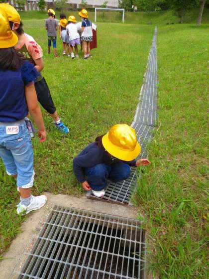 側溝の溝の中にアメンボがいるのをキラキラした目で見つめている子もいます。