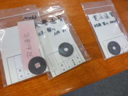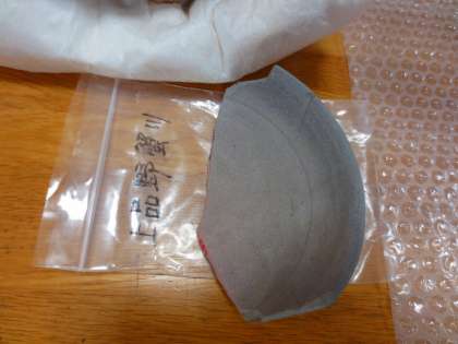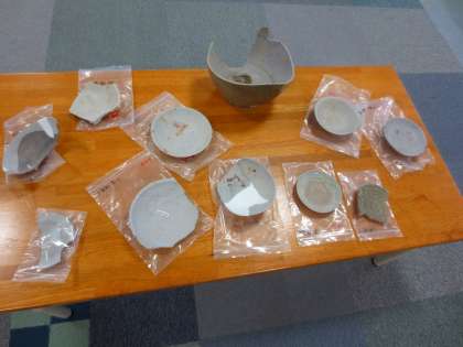 持ってきた遺物をみると「品野蟹川」と書いてあります。本校の敷地や横の直線道路の工事で発掘された遺物です。よくよく聞いてみると「他校は、市内全域の遺物を見せますが、品野台だけは自分足下にあった遺物があるので、特別に違うものをもってきているんですよ」という話でした。