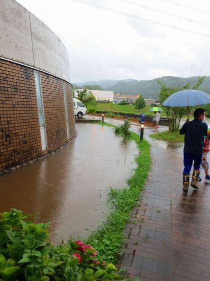 なお、昇降口横のせせらぎも満水です。下校途中に足や傘を急流に入れてみたり、水たまりをわざと歩いてみたりしないよう注意して帰しました。