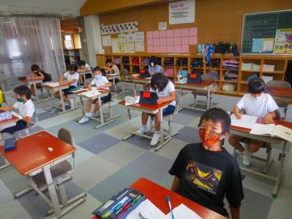 今日は朝からとても蒸し暑いので、エアコンを入れています。授業中でも必要に応じて、水分補給をしたり、無言であればマスクの一時外しも認めています。