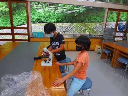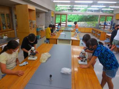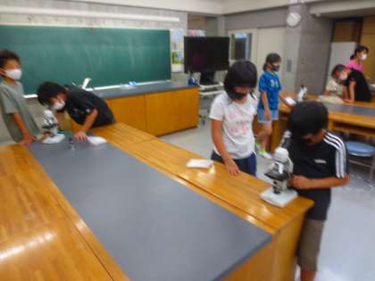 花粉を顕微鏡で見ています。とてもよく見えるのであちこちから「校長先生、すごいよー」と声がかかります。