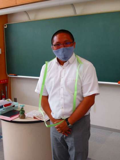 おやおや担任が子どものリクエストによって、なにかを首から提げています。