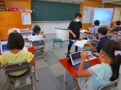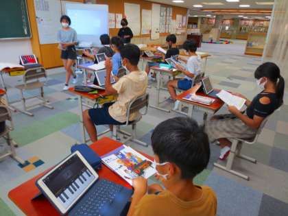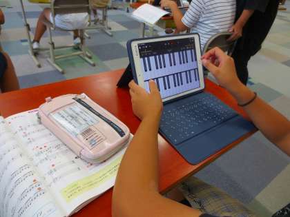 教室でタブレットを使って音楽です。電子ピアノという実物があるのにタブレットにこたわるには理由があります。それが授業を見ていてわかりました。