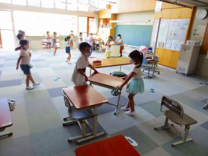 おやおや1年生では自分たちの机を移動しています。