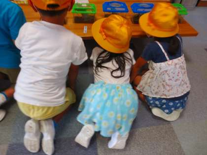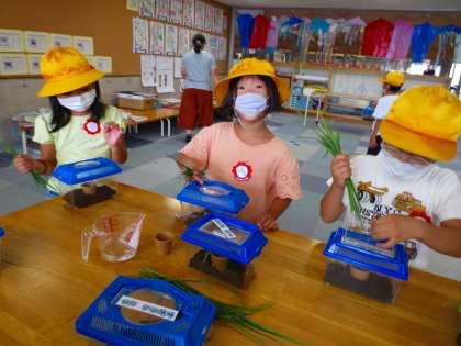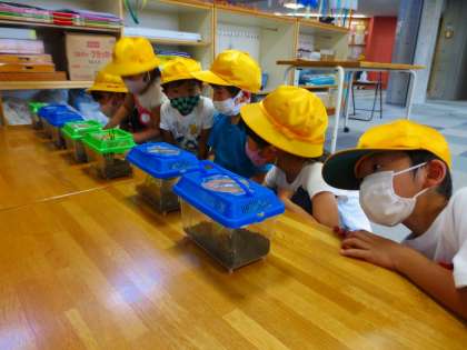 小さな1年生が、ちいさな虫かごを観察する姿勢が、とても愛くるしいです。