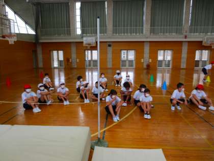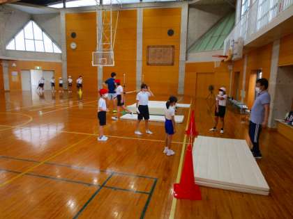 体育館で高跳びに挑戦です。今日は小中一貫教育推進教員の品野中学校の教諭がきています。場所も3カ所にし、待ち時間が少なくなるようにしたり、ゴム紐の高跳びを用意したりと工夫がされていますね。