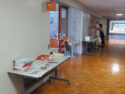 午前中に司書さんが、新しい本を入り口に並べていました。