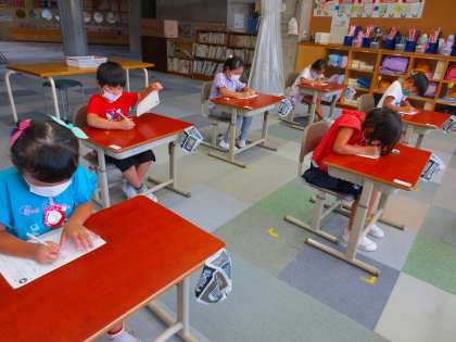 「名前も点にいれるからねー」と言われて、みんな何回も書き直して、上手な名前を書いています。