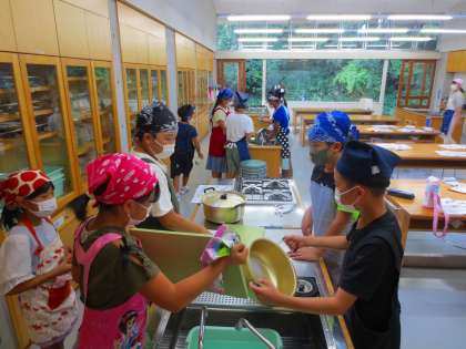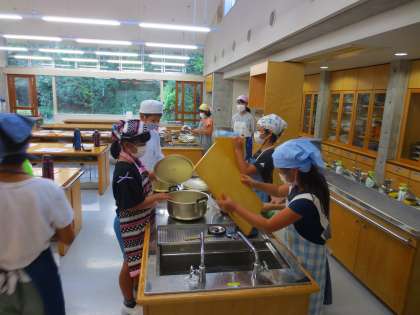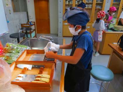 緊急事態宣言が解除になり、調理実習を始めました。野外活動に向けて、切ったり剥いたり、そして煮たりといろいろな経験をしていきます。
