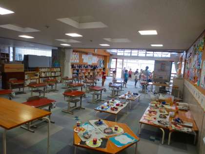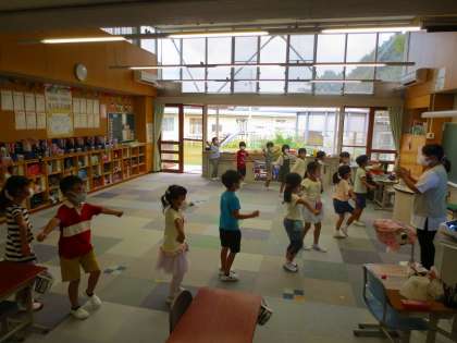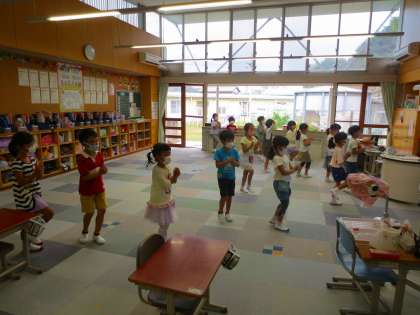 ワークスペースに机を全部移動させて、運動会の演技の隊形移動を練習していました。