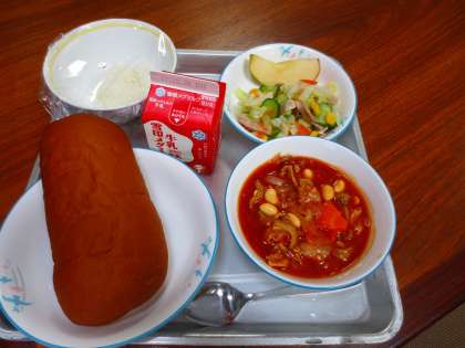 ポークビーンズと野菜サラダ、そしてパンですね。