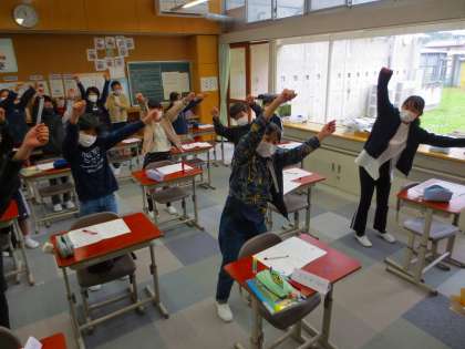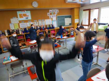 音楽室で野外活動に向けて練習していたらしいのですが、取材に行けず、代わりに教室で「鬼のパンツ」を踊ってくれました。