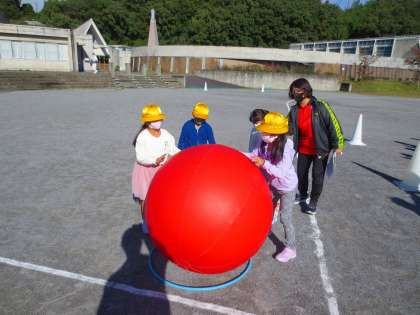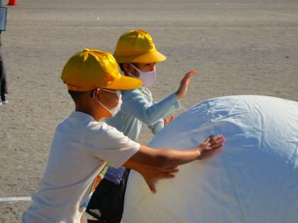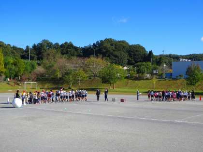 きのうの続きで、大玉おくりをしています。今日は実際にころがしていますね。1・2年生だけ転がしました。3年生以上は本番に頑張ってください。