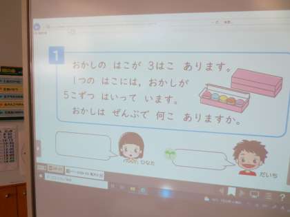 文章題で、式が3×5か、5×3かを話し合っています。大人になるとかけ算なんてどちらが先でも答えは一緒だから気にしないよとなるのですが、実はちゃんと順番が決まっているのです。