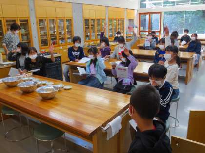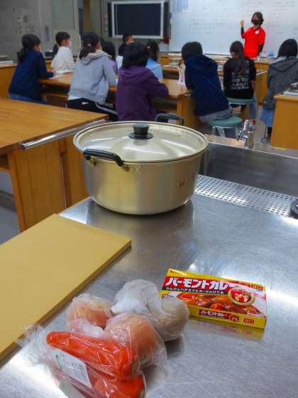 続いて家庭科室でカレーやパン作り、飯ごうの段取りの説明を聞いています。