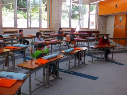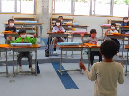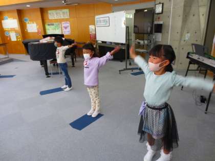 みんなの前で3人ずつ、振りつけをいれて踊っています。