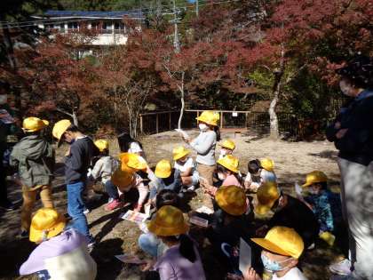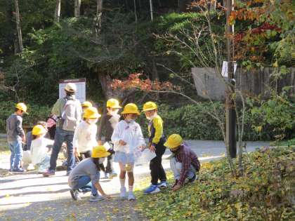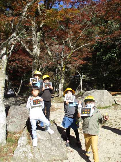 お天気にも恵まれ、岩屋堂へ1、2年生で校外学習に出かけました。ちょうど紅葉し始めた頃の公園内で、ネイチャーゲームを楽しみました。カードにある様々な色と同じもの探す「森の色あわせ」ゲームや、拾ってきた落ち葉を使って「落ち葉の窓」作りをしました。様々な色の落ち葉や木の実を上手に飾り、すてきな作品に仕上がりました。