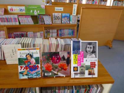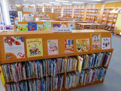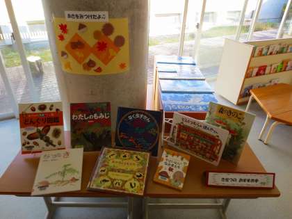 6年生のブックトークの様子をみながら、改めて図書室を見ると、いろいろなコーナーが作られていることに気づきました。これらは週1回来校する司書さんの企画です。