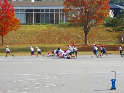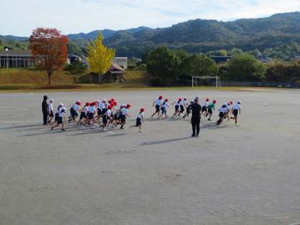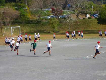 最初に3分間走をしました。途中、いかにも転んでいるように見えますが、腹ばいになったり、仰向けに寝たりし、体幹を鍛えつつ走ります。指導者曰く「持久走の練習を意識して走らせています。全体的に少し走る体になっていないので慣らしていきます」ということでした。