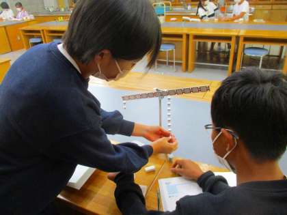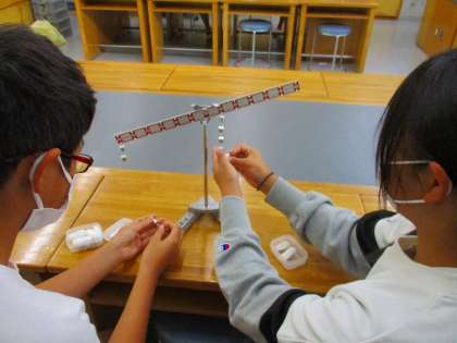 「てんびんとおもり」の実験を理科室でやっています。実際の生活ではてんびんなんか使いませんが、釣り合いを取るための理屈をしっておくことはとても役に立ちます。