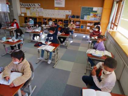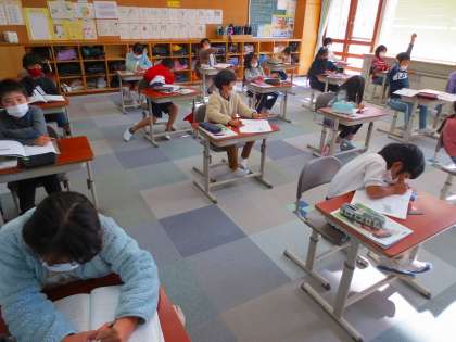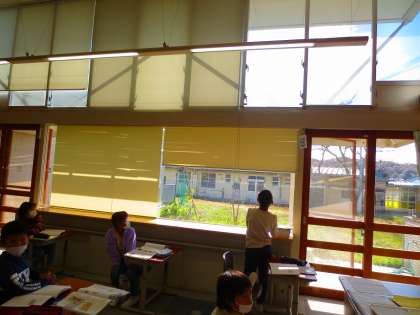 太陽光が当たると熱いので、プラインドカーテンを下げています。ブラインドカーテンも他校ではなかなかみられない仕様です。