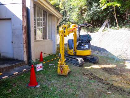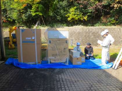 老朽化した音楽室のエアコンの交換で、いよいよ室外機の設置が始まりました。