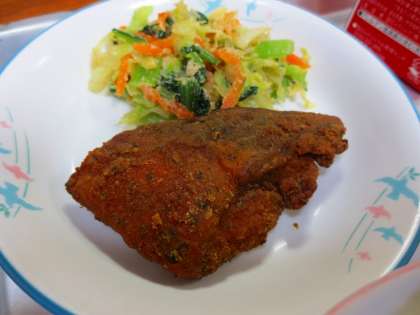 サバをカレー風味に揚げてあるそうです。食べるととてもスパイシーで美味しかったです。時々ある応募献立は、普段とは違う味がするので、とても楽しみです。