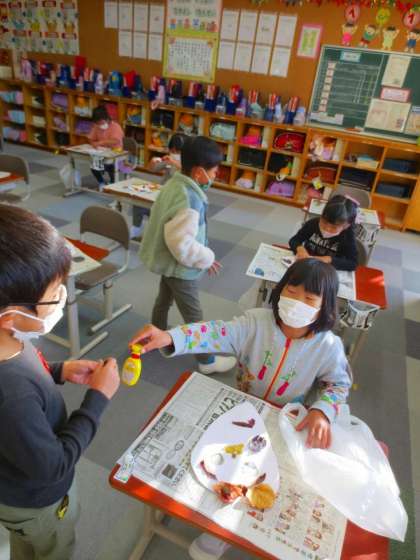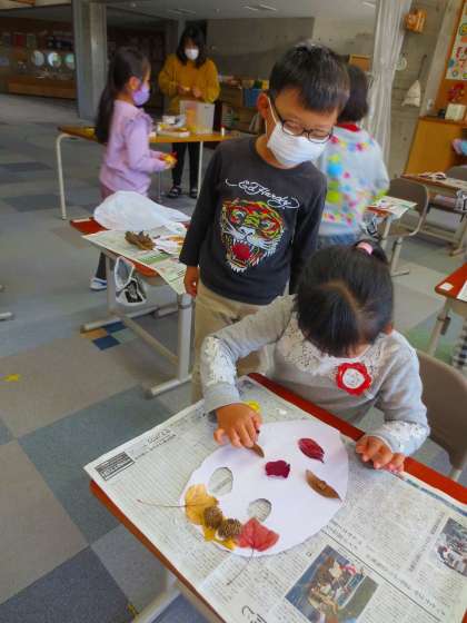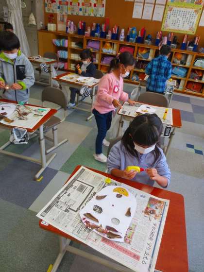 ドングリの実で目を作ったり、葉っぱで髪の毛を作ったりととても楽しそうに取り組んでいました。
